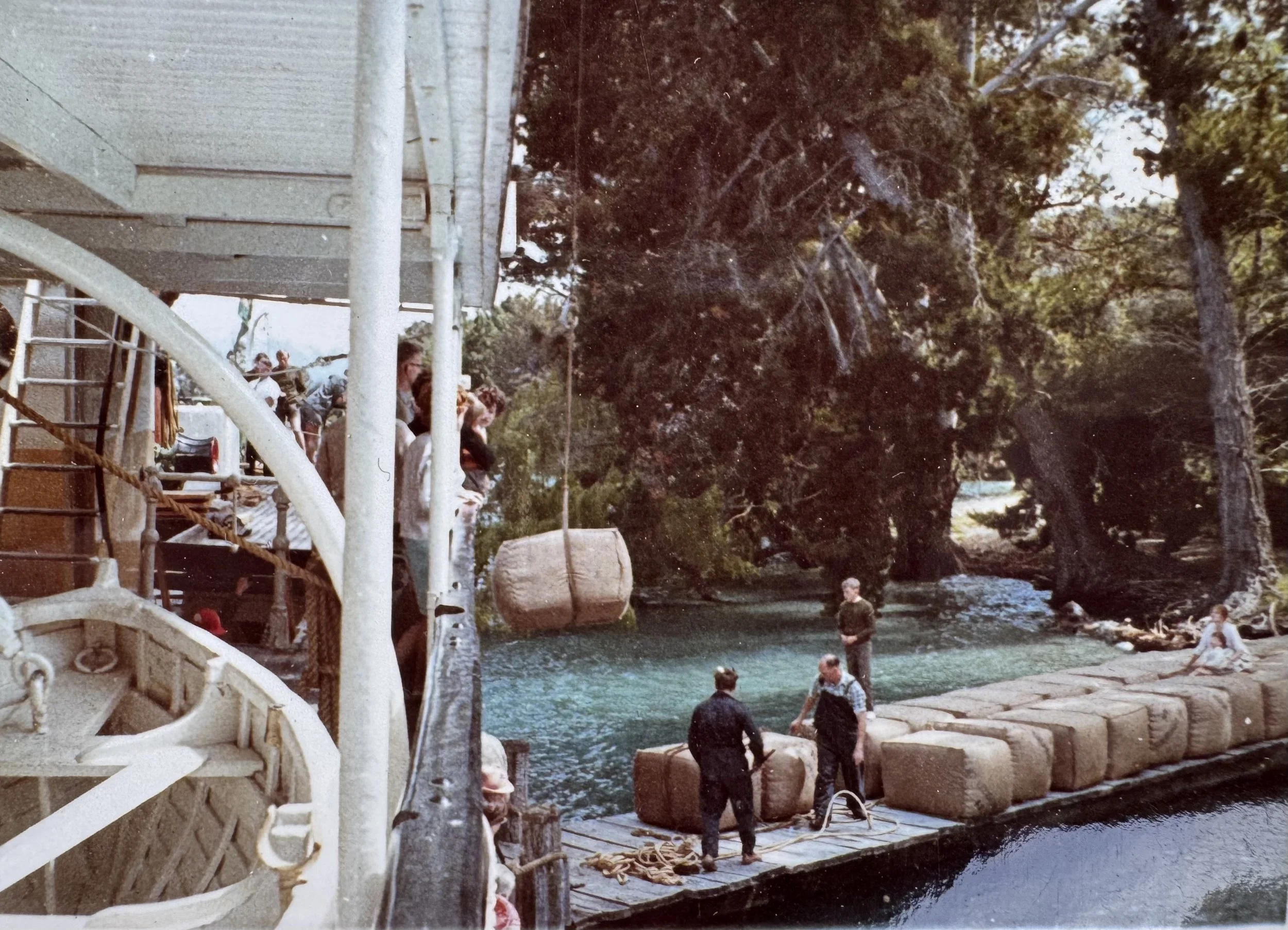 There’s a photograph from Mount Creighton Station in 1967. Bales of wool are being loaded onto the Earnslaw from the end of the station jetty. A man on the wharf signals up to the winch. The crane takes the strain. The bale lifts clean off the deck and swings slowly over the water like a pendulum.