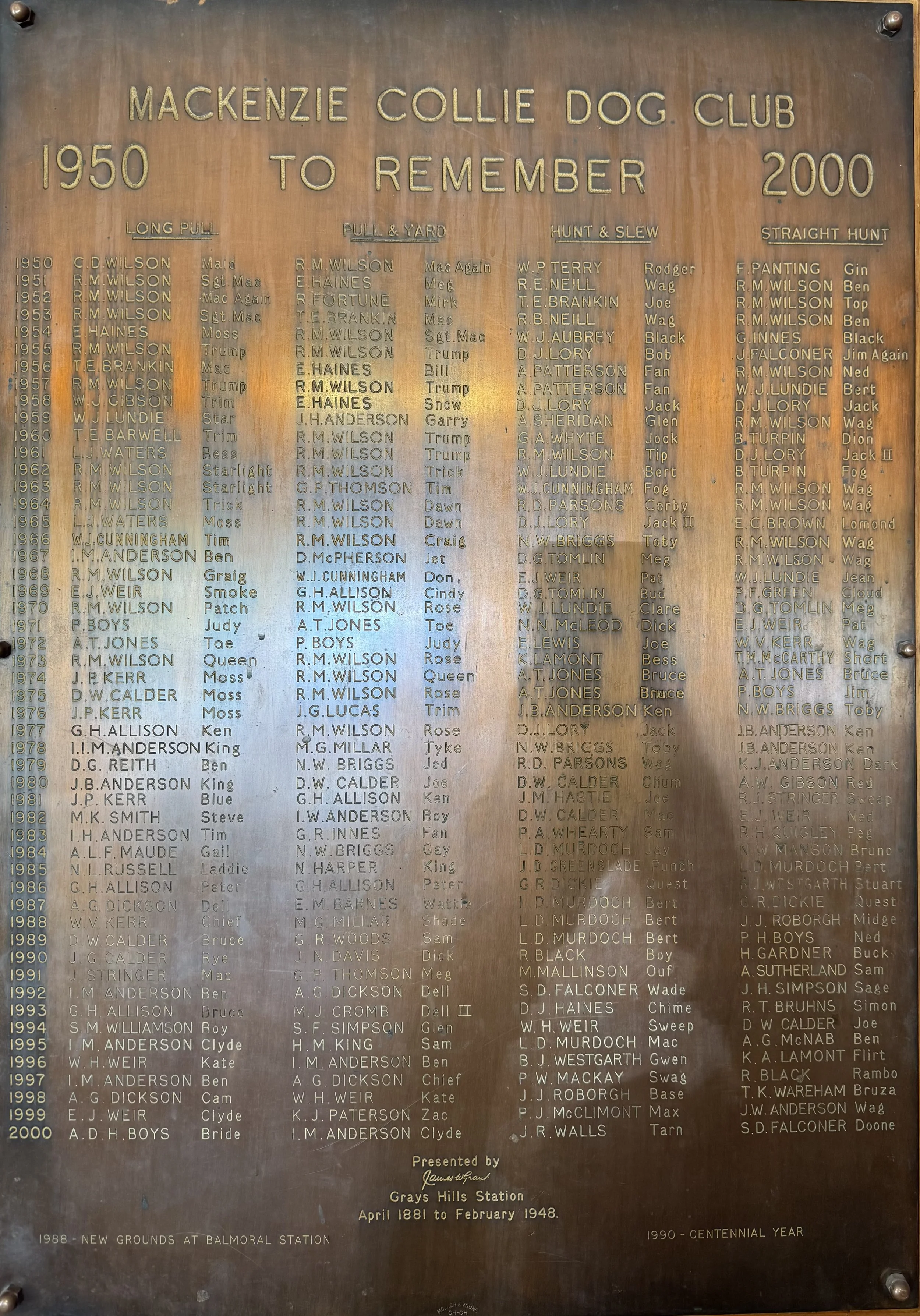 Those plaques carry history in every engraved line. They bear the names of all the shepherds who have won open titles at the Mackenzie Collie Club Trials. Names I remember: Geoff Allison, Tony Wall, Stuart Falconer, Ian Anderson, J.P. Kerr, Bruce Westgarth, Larry Murdoch. Men I worked with at Grampians, Black Forest, Dry Creek, and Blue Mountain. Men whose dogs could slide a mob through a tight gate without breaking stride. Men who drank their tea black and counted sheep in twos without blinking.