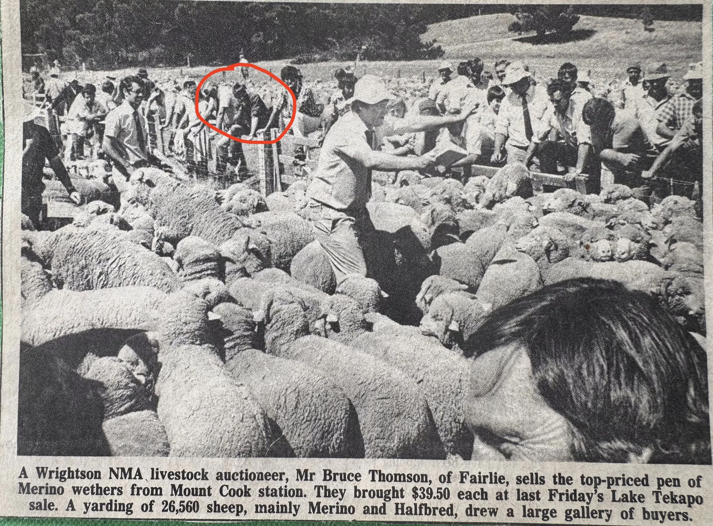 The Tekapo Sale, 1984. This clipping is from the Timaru Herald. The young fellow (circled), looking sagely at the yarding, is me.