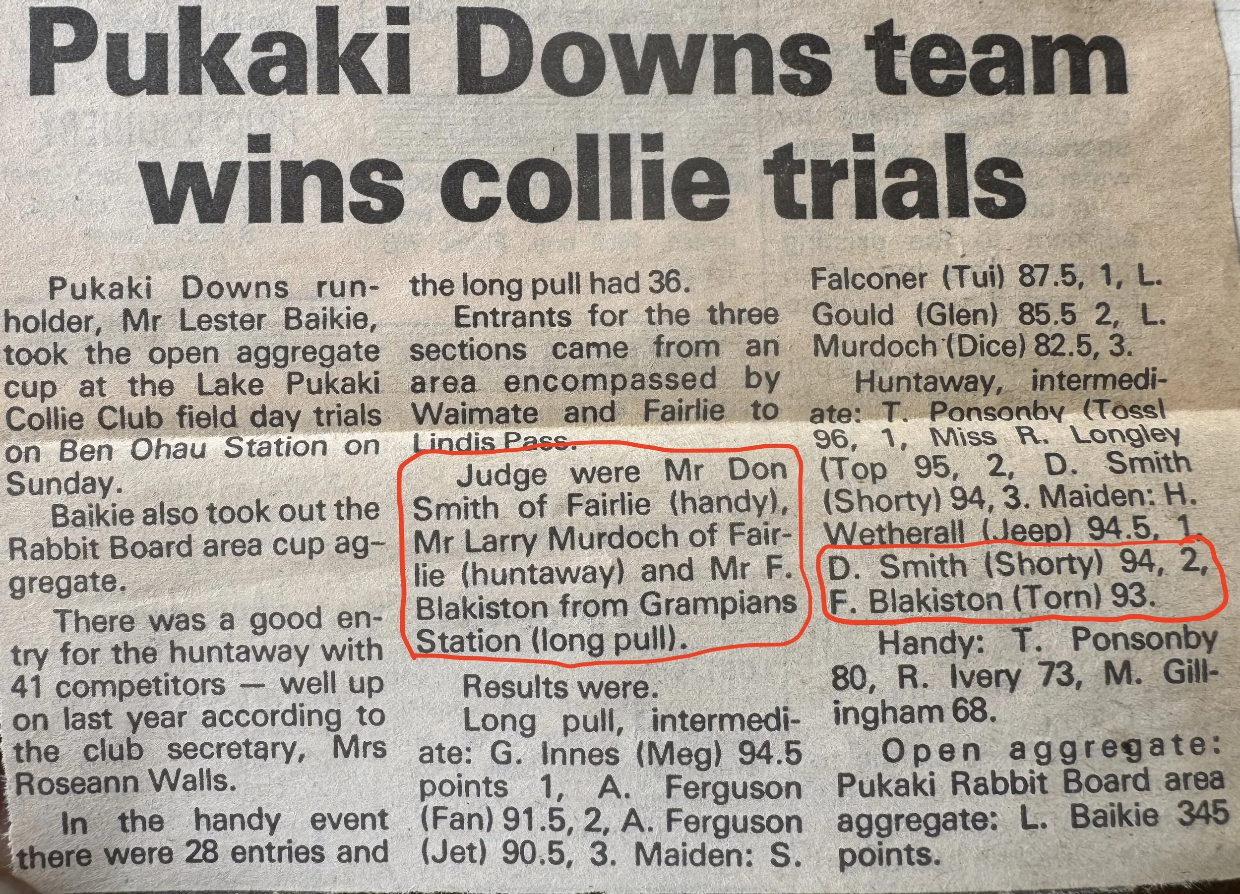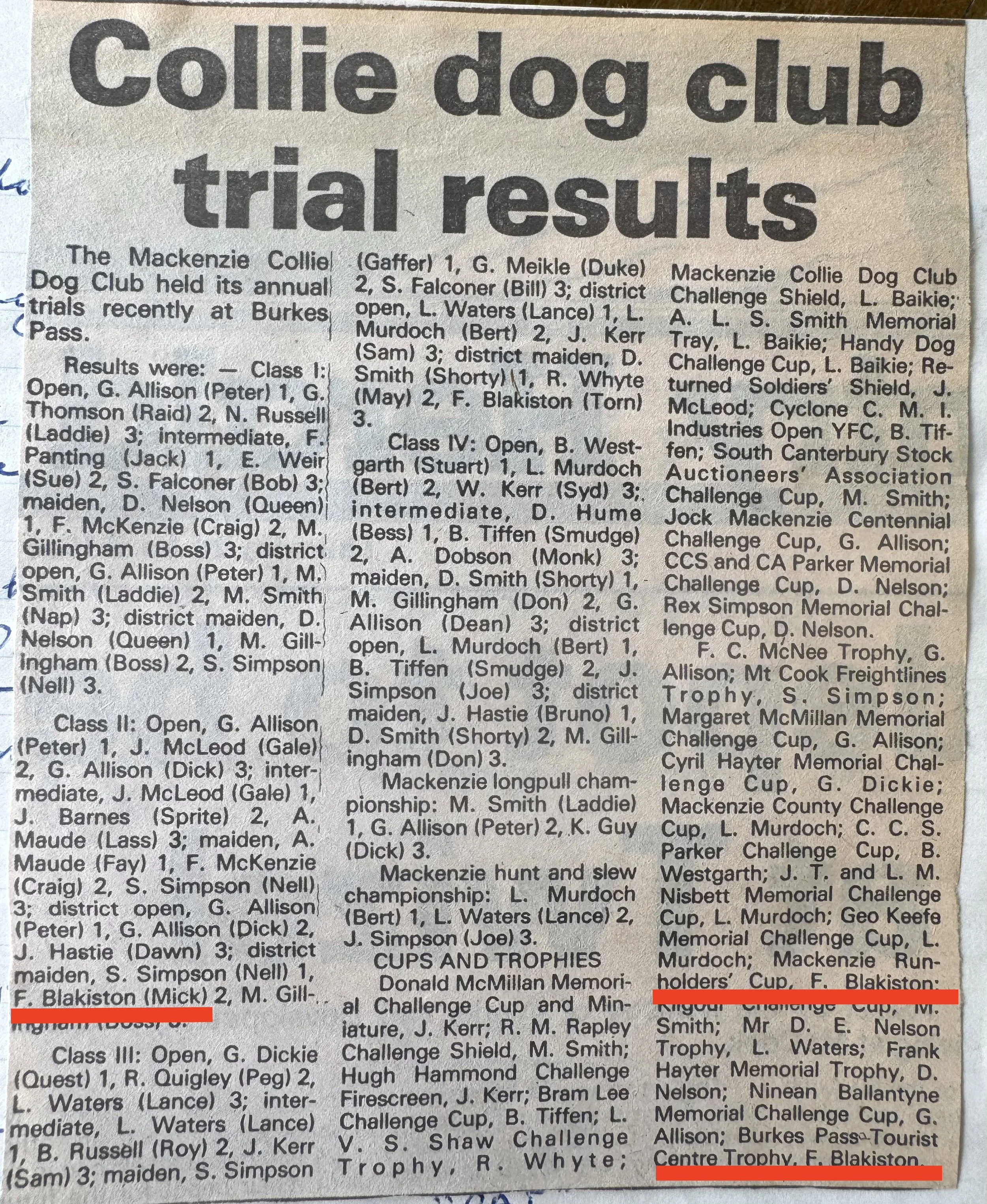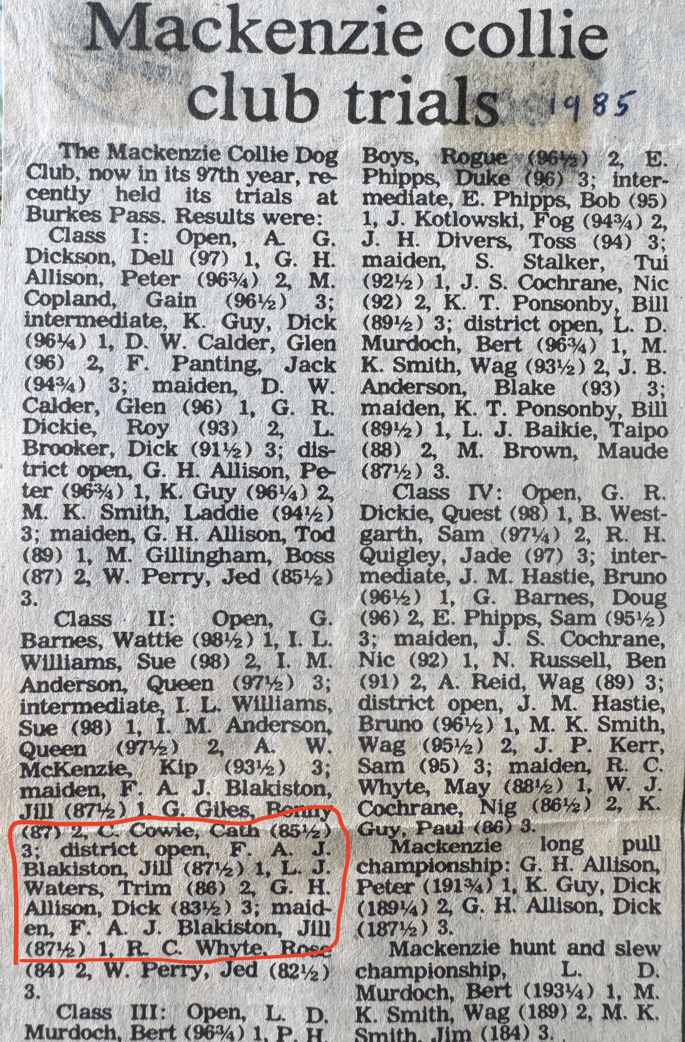 Dog trials weren’t just a sport. They were a measure of a shepherd’s skill, a place where quiet men became local legends for a perfect cast, a clean lift, or a tricky pen done smooth as silk. I earned my own modest place in that lineage with Jill, my quiet-eyed heading dog. We won the plate and cup at the 1985 Burke’s Pass trials. I still have the clippings somewhere—Jill, Tornado, Mick, Bess—all mentioned in print, my name beneath theirs like a footnote.